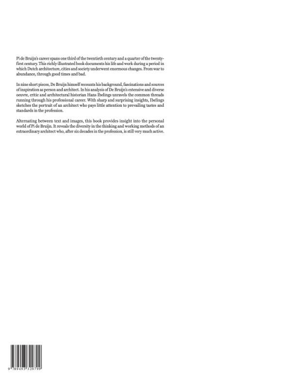 Pi de Bruijn’s career spans one third of the twentieth century and a quarter of the twentyfirst century. This richly illustrated book documents his life and work during a period in which Dutch architecture, cities and society underwent enormous changes. From war to abundance, through good times and bad. In nine short pieces, De Bruijn himself recounts his background, fascinations and sources of inspiration as person and architect. In his analysis of De Bruijn’s extensive and diverse oeuvre, critic and architectural historian Hans Ibelings unravels the common threads running through his professional career. With sharp and surprising insights, Ibelings sketches the portrait of an architect who pays little attention to prevailing tastes and standards in the profession. Alternating between text and images, this book provides insight into the personal world of Pi de Bruijn. It reveals the diversity in the thinking and working methods of an extraordinary architect who, after six decades in the profession, is still very much active