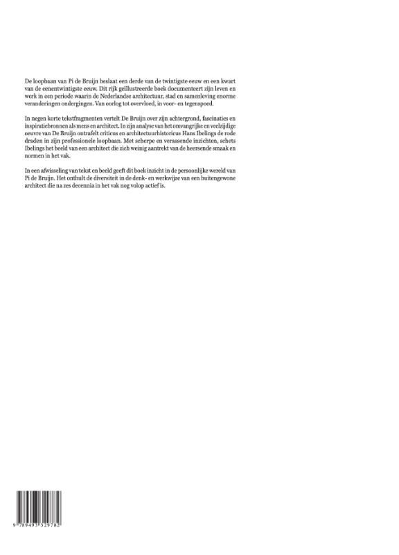 De loopbaan van Pi de Bruijn beslaat een derde van de twintigste eeuw en een kwart van de eenentwintigste eeuw. Dit rijk geïllustreerde boek documenteert zijn leven en werk in een periode waarin de Nederlandse architectuur, stad en samenleving enorme veranderingen ondergingen. Van oorlog tot overvloed, in voor- en tegenspoed. In negen korte tekstfragmenten vertelt De Bruijn over zijn achtergrond, fascinaties en inspiratiebronnen als mens en architect. In zijn analyse van het omvangrijke en veelzijdige oeuvre van De Bruijn ontrafelt criticus en architectuurhistoricus Hans Ibelings de rode draden in zijn professionele loopbaan. Met scherpe en verassende inzichten, schets Ibelings het beeld van een architect die zich weinig aantrekt van de heersende smaak en normen in het vak. In een afwisseling van tekst en beeld geeft dit boek inzicht in de persoonlijke wereld van Pi de Bruijn. Het onthult de diversiteit in de denk- en werkwijze van een buitengewone architect die na zes decennia in het vak nog volop actief is