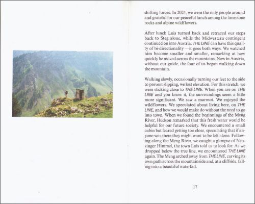 ‘THE LINE’ documents the exploration of contemporary landscapes by walking along a straight line around the Earth. This volume explores a remote valley in the Vorarlberg region of the Austrian Alps. Besides photographs by Mary Dahlman Smith, Luis Hilti, and Drew Smith, it includes a conversation with Ingrid Sele, a resident of Nenzinger Himmel, which is the local name given to a collection of seasonal high-alpine settlements. ‘THE LINE’ is a project by the Institute for Linear Research, an independent research platform.