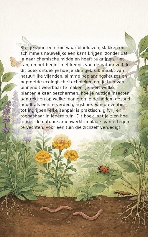 Stel je voor: een tuin waar bladluizen, slakken en schimmels nauwelijks een kans krijgen, zonder dat je naar chemische middelen hoeft te grijpen. Het kan, en het begint met kennis van de natuur zelf. In dit boek ontdek je hoe je slim gebruik maakt van natuurlijke vijanden, slimme beplantingskeuzes en beproefde ecologische technieken om je tuin van binnenuit weerbaar te maken. Je leert welke planten elkaar beschermen, hoe je nuttige insecten aantrekt en op welke manieren je de bodem gezond houdt als eerste verdedigingslinie. Van preventie tot ingrijpen: elke aanpak is praktisch, gifvrij en toepasbaar in iedere tuin. Dit boek laat je zien hoe je met de natuur samenwerkt in plaats van ertegen te vechten, voor een tuin die zichzelf verdedigt.