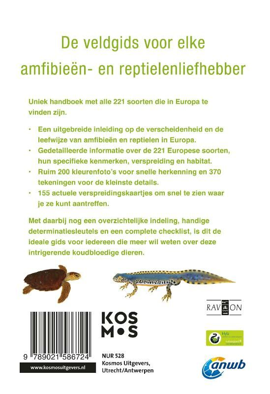 In deze gids vind je alle amfibieën- en reptielensoorten die er in Europa te vinden zijn. De 221 soorten zijn gedetailleerd beschreven, compleet met hun specifieke kenmerken, verspreiding en habitat. Met de ruim 200 foto's kun je een amfibie of reptiel snel herkennen; 370 tekeningen tonen de kleinste details. Het boek bevat 155 actuele verspreidingskaartjes om te zien waar je ze kunt aantreffen.