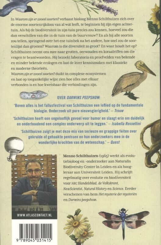 In Waarom zijn er zoveel soorten? verbaast bioloog Menno Schilthuizen zich over de enorme soortenrijkdom van al wat leeft, te beginnen bij zijn eigen achtertuin. Als hij de biodiversiteit in zijn tuin precies zou kennen, hoeveel zou die dan verschillen van die in de tuin van de buurvrouw? En als hij alle soorten zou tellen, springend over het ene tuinhek na het andere, hoe snel zou de soortenlijst dan groeien? Waarom is die diversiteit zo groot?